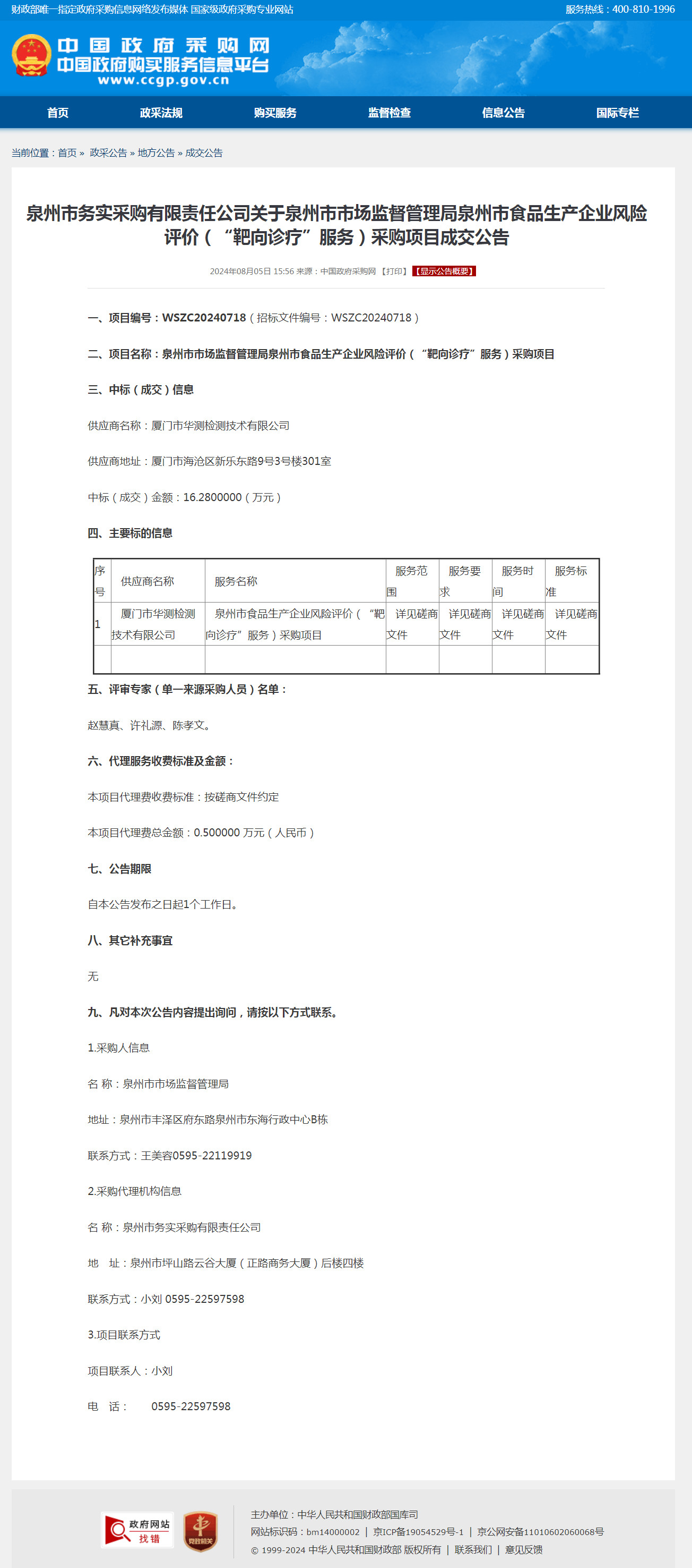 泉州市食品生产企业风险评价(“靶向诊疗”服务)采购项目成交公告