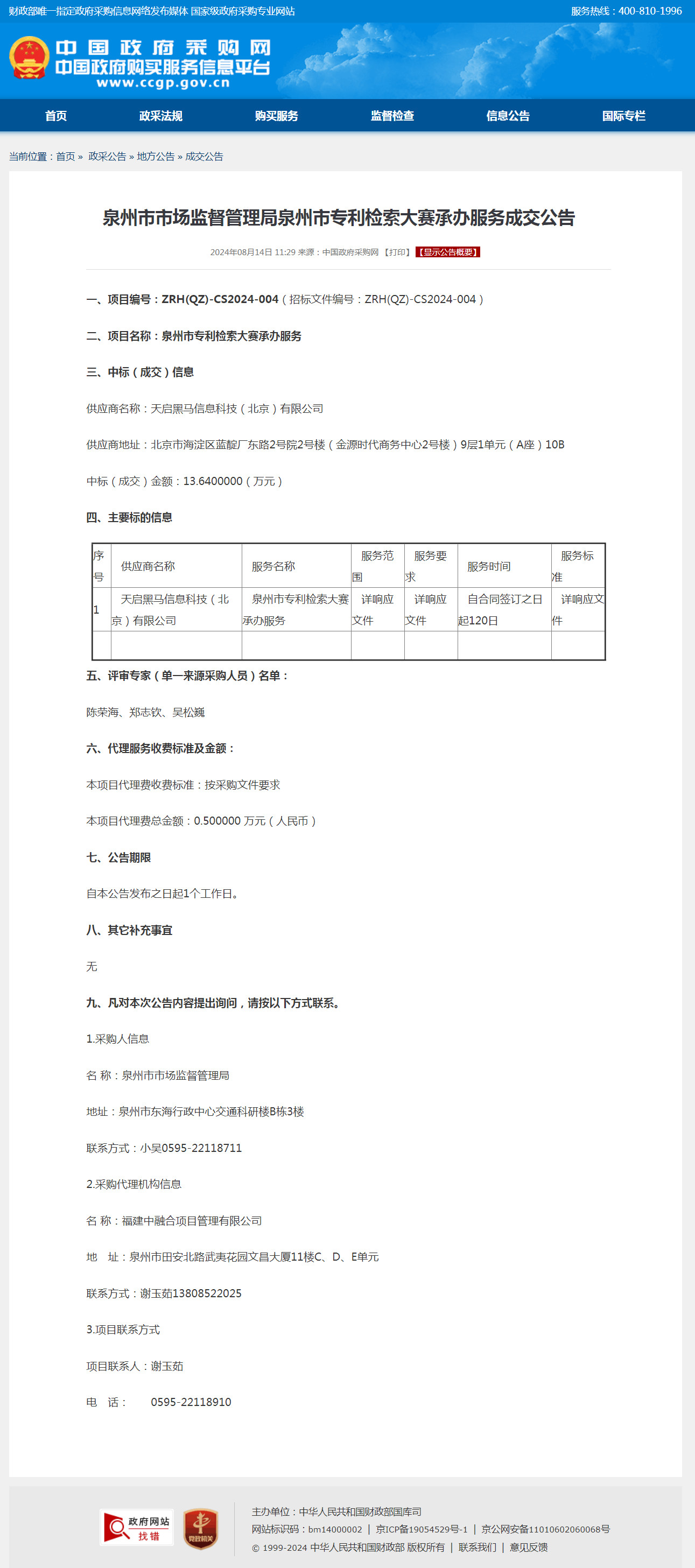 泉州市专利检索大赛承办服务成交公告