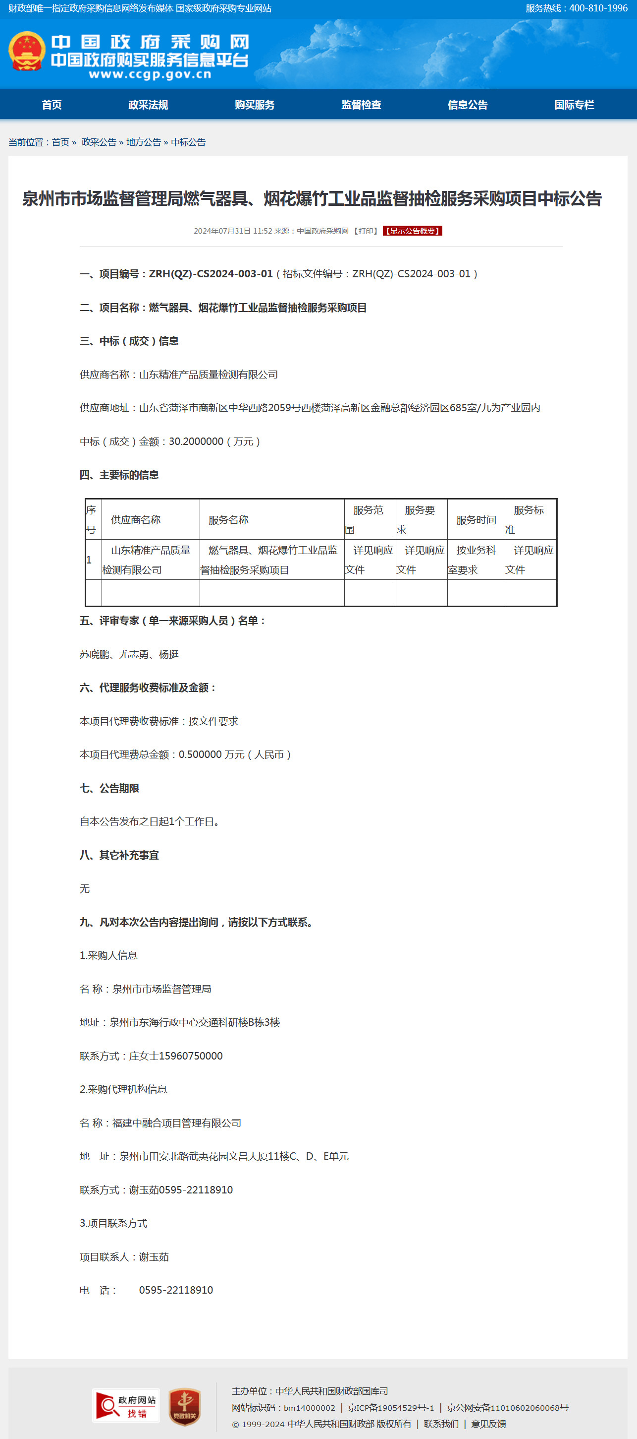 燃气器具、烟花爆竹工业品监督抽检服务采购项目中标公告